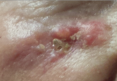 A 16-year-old girl is referred to dermatology by her pediatrician for evaluation of a rash on her face. She is currently taking acyclovir (dose...