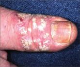 About a year ago, this 40-year-old man developed scaling on the distal one-third of his thumbnail.
