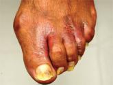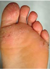 The distraught mother of an 8-year-old boy brings him urgently to dermatology for evaluation of a condition that has affected his feet for the...