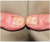 A 56-year-old man is referred to dermatology for evaluation of a “fungal infection” that has affected both thumbnails for at least 20 years. While...
