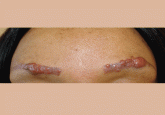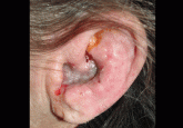 A 54-year-old woman presented with a 7-day history of odynophagia, pharyngeal swelling, and painful skin lesions on her ear. What does she have?...