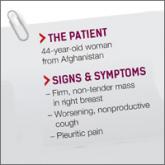 Firm, non-tender mass in right breast • worsening, nonproductive cough • pleuritic pain • Dx?