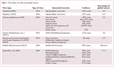 German virologist Harald zur Hausen received the Nobel Prize in 2008 for his discovery of the oncogenic role of human papillomaviruses (HPVs), a large family of more than 100 DNA viruses that infect the epithelial cells of the skin and mucous membranes. They are responsible for the largest number of virally associated cancer cases globally – around 5% (Table 1).