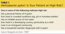 H pylori risk. Because of the association between dyspepsia and H pylori, evaluating the patient’s risk for infection with this bacterium, based primarily on his or her current and previous living conditions (see Table 1),9 is the next step. Although a test for H pylori could be included in the initial work-up of all patients with dyspepsia, a better—and more cost-effective—strategy is to initially test only those at high risk. (Testing and treating H pylori will be explored further.)