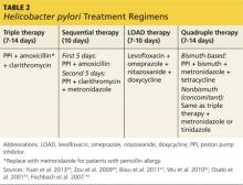 The triple-therapy regimen (a PPI + amoxicillin + clarithromycin) is the most common firstline H pylori treatment in the US and a good initial choice in regions in which clarithromycin resistance is low (see Table 2).39-44 The standard duration is seven days.