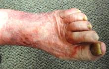 A KOH prep of the rim of the feet is positive for fungal elements, as is a similar microscopic examination of scrapings from the dorsum of the left foot. In fact, the fungal elements seen on the latter are so numerous and dense that they are initially difficult to see.