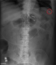 Answer The radiograph demonstrates a normal gas pattern with a properly placed enteric feeding tube, which appears to be within the stomach. Of note is a sclerotic-appearing lesion on the posterior aspect of the left eighth rib. In a patient with a possible tumor, this lesion poses concern for potential metastasis and warrants appropriate work-up.