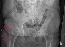 Answer The radiograph shows no acute fracture or subluxation. Diffuse osteopenia is present. Increased density is noted within the soft tissue lateral to the trochanteric portion of the right femur; this likely represents a contusion or hematoma.