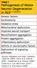 The exact etiology of sporadic ALS remains unknown, but gene mutations have also been implicated, including the ANG gene21 and TDP-43.18 Other theories include increased levels of glutamate (which have been detected in cerebrospinal fluid and serum of patients with ALS), mitochondrial dysfunction, free radical injury, programmed cell death, neurofilament defects, viral infections, and autoimmune dysfunction19,20 (see Table 13,17,18,20,21). It is possible that a combination of factors is involved in the development of sporadic ALS.