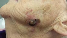 An 84-year-old woman has had a lesion on her face for 10 years. During that time, it has slowly changed, becoming darker and larger. For the past few months, it has developed a new, raised area in its center.