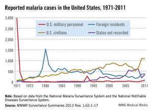The number of malaria cases reported in the United States for 2011 was the highest since 1971, according to the Centers for Disease Control and Prevention.