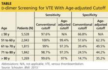 Schouten et al1 performed a systematic review and meta-analysis of studies of older patients with suspected VTE who had d-dimer testing using both conventional and age-adjusted cutoff values. The authors searched Medline and Embase for studies that were performed in outpatient, inpatient, or emergency department settings. They excluded studies of high-risk patients, specifically perioperative patients and those who’d had VTE, cancer, or a coagulation disorder.