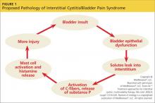 THE PROPOSED PATHOPHYSIOLOGY IC/BPS is thought to begin with an initial insult to the bladder that leads to dysfunction of the epithelial layer. This insult may be the result of a neurogenic inflammation, autoimmunity, subclinical or chronic infection, or bladder urothelial defects.1 Dysfunction in the epithelial layer includes altered bladder epithelial expression of human leukocyte antigen I and II; decreased expression of uroplakin (an antitoxic protein in the bladder), and a defective glycosaminoglycan mucus layer.4 This damage to the epithelial layer alters the permeability of the bladder, allowing potassium ions to enter the urothelium and depolarize motor and sensory nerves. This potassium leak then activates the mast cells, causing mastocytosis and the release of histamine.11 These processes disrupt the homeostasis of the urinary tract and allow the development of inflammation—a main cause of the pelvic pain associated with IC/BPS4,12,13 (see Figure 114).