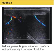 The patient was given adequate parenteral pain medication. After color Doppler ultrasound confirmed the torsion, the testicle was laterally rotated approximately 360°. The patient reported alleviation of his symptoms. Color Doppler was again performed to confirm the return of hyperemic blood flow to the affected testicle (Figure 2). The urologist arrived shortly thereafter and the patient was taken to the operating room, where he underwent scrotal exploration and bilateral orchiopexy.