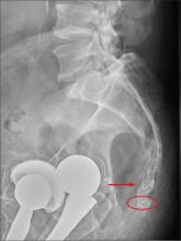 There are degenerative changes present. Bilateral hip prostheses are noted. Within the coccyx, there is bone remodeling and angulation that are likely chronic and related to remote trauma or injury (arrow). Below this, some cortical lucency (circled) is noted, most likely consistent with an acute fracture. The patient was prescribed a nonsteroidal medication and a mild narcotic pain medication.