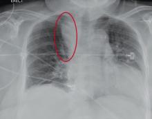 As you review her lab results, one of the nurses mentions that the radiology department called about “something abnormal” on the patient’s chest radiograph. You pull up the patient’s portable chest radiograph on the computer to review. What is your impression?