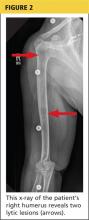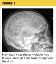 The patient continued to experience vague abdominal, back, and rib pain that seemed to migrate daily and worsened with movement. A skeletal x-ray was performed and revealed numerous lytic lesions of the skull (Figure 1), midright humerus (Figure 2), and distal left radius.