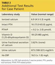 The patient was admitted to the hospital for treatment of hypercalcemia and hypokalemia and for work-up of elevated alkaline phosphatase and abdominal pain. Upon admission, serum ionized calcium measurement confirmed true hypercalcemia. Additional diagnostic tests were then ordered to help differentiate between parathyroid hormone (PTH)–mediated and non-PTH–mediated causes for the hypercalcemia (see Table 2).