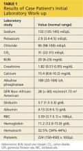 Laboratory work-up revealed marked hypercalcemia (15.4 mg/dL), electrolyte abnormalities, anemia, impaired renal function, and elevated alkaline phosphatase and globulin levels (see Table 1). In addition, a plain abdominal x-ray series was negative for acute findings, but x-rays of the right ribs revealed a fracture of the sixth rib and osteopenia.