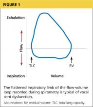 Examination of the flow-volume loops recorded when a patient experiences “wheezing” during spirometry testing reveals a flattened inspiratory loop, indicating a decrease of airflow into the lungs (see Figure 1).13,16 “Wheezing” is actually a misnomer in this situation because the term typically refers to sounds that occur during expiration.