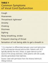 The patient may present with complaints of atypical chest pain, throat tightness, stridor, choking, difficult vocalization, cough and sometimes dysphagia, GERD, or rhinosinusitis (see Table 1). These signs and symptoms may occur without provocation, or patients may relate a history of triggers such as anxiety, irritant exposure, or exercise. In fact, about 14% of VCD is associated with exercise, particularly in young female athletes who experience shortness of breath and even stridor with exercise.19