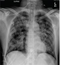 ANSWER The radiograph demonstrates bilateral patchy, fluffy infiltrates as well as what is sometimes referred to as ground-glass opacities. In the setting of trauma and respiratory compromise, these areas are most suggestive of pulmonary contusions and early acute respiratory distress syndrome. Other possibilities in the differential diagnosis include pulmonary edema, atypical pneumonia, and pulmonary metastases.