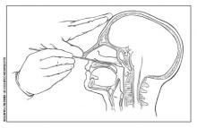 COLLECTING A SWAB FOR PERTUSSIS TESTING The illustration below shows the correct swab and sampling method. Swab tips may be polyester (such as Dacron or rayon) or they may be nylon-flocked. Cotton-tipped or calcium alginate swabs are not acceptable because the residue will inhibit DNA assays.21 The specimen must be obtained from the posterior nasopharynx and not the nares or oropharynx. The Centers for Disease Control and Prevention offers a video that demonstrates how to properly collect a specimen for testing at http://www.cdc.gov/pertussis/clinical/diagnostic-testing/specimen-collection.html.