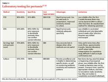 Four methods of lab testing for pertussis infection are polymerase chain reaction (PCR), direct fluorescent antibody (DFA) testing, serologic testing, and culture (TABLE 3).17-19 The sensitivity of these tests is as follows: PCR, 90% to 95%; DFA, 50% to 60%; serologic testing, 70% to 80%; and culture, 50% to 70%. The specificity is: PCR, 95% to 98%; DFA, 90% to 100%; serologic testing, 90% to 100%; and culture, 100%.