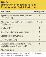 Patients should be advised of the major risk for bleeding associated with all anticoagulant therapies.27 Screening for bleeding includes assessment of Hypertension, Abnormal renal and/or liver function, previous Stroke, Bleeding history, Labile INR, being Elderly, and currently prescribed Drugs and/or excessive use of alcohol (known as HAS-BLED) (see Table 4).1,28 Use of a bleeding risk assessment tool such as HAS-BLED may help identify the patient’s risk but cannot be the basis for treatment decisions.1,29