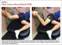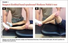 Patients with ITBS often complain of persistent nontraumatic knee pain that worsens with repetitive knee flexion.Diagnosis. Patients often complain of persistent nontraumatic lateral knee pain that worsens with repetitive knee flexion (eg, running or cycling).17-19,37 A physical exam will often reveal pain over the lateral femoral condyle and a positive Noble’s test (FIGURE 1). A positive Ober’s test (FIGURE 2) is suggestive of ITBS, as well. The sensitivity and specificity of these tests are not well established, but in patients performing repetitive knee flexion activities with subjective lateral knee pain, pain over the lateral femoral condyle and a positive Ober’s and/or Noble’s test suggest an ITBS diagnosis.18 Imaging is not indicated initially, but MRI should be used in refractory cases to rule out other etiologies.17,19