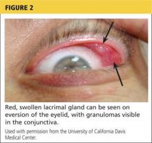 Sarcoidosis. Sarcoidosis is a multisystem inflammatory disease characterized by noncaseating epithelioid granulomas in affected organs.6 More than 90% of patients with sarcoidosis present with pulmonary symptoms, including shortness of breath, cough, and pleuritic chest pain.6-8 Ocular manifestations, such as uveitis, iritis, or conjunctivitis, are less common, developing in 30% to 60% of patients.2,9,10 In addition, rashes, lesions, or cutaneous skin nodules, including erythema nodosum and lupus pernio, are seen in 25% to 35% of patients.2,6