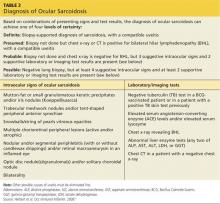 In an effort to address these challenges, the International Workshop on Ocular Sarcoidosis (IWOS) developed a standardized approach to diagnosis.9 The group first identified seven intraocular signs of ocular sarcoidosis and then five laboratory or imaging tests that are of value in making the diagnosis in patients with these signs. Last, they established four levels of certainty for the diagnosis of ocular sarcoidosis, based on these signs, tests, and biopsy results, if available (see Table 2).