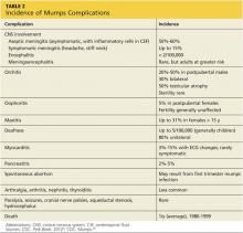 Immunization modifies the clinical presentation of mumps11 and likely decreases complications. Although one analysis of the 2006 outbreak identified no difference in complication rates between vaccinated and unvaccinated patients, the authors attributed this to misclassification of patients’ vaccination status; they did find lower reported rates of mumps complications compared with complication rates before widespread vaccination.13 A study of the 2009-2010 outbreak found that complication rates were lower among vaccinated patients.18