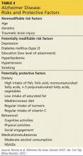 Numerous risk factors have been associated with an increased risk for AD (see Table 4).2,3 Some, like age and genetics, are nonmodifiable, while others—particularly cardiovascular risk factors—can be modified.1 There are also factors associated with decreased risks—most notably, physical exercise and participation in cognitively stimulating activities.3 Identification of these factors has led to the hope that addressing them can prevent AD.