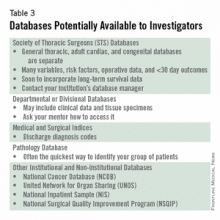 Most would agree that data collection is the most painful part of doing clinical research. However, there are a few tricks to ease your pain. First, there are many databases available that you may be able to harvest data from to minimize your chart work (Table 3). Before you hit the charts, it is essential to think through every step of the project. Anticipate problems (where in the chart will you locate each data point), do not collect unnecessary data points (postoperative data #3 serum [Na+] when looking at survival of thoracoscopic vs. open lobectomy), meet with your statistician beforehand to collect data for the correct analysis, collect the raw data (creatinine and weight, not presence of renal failure and obesity).