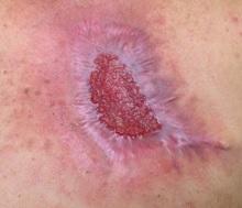 We present this case as an example where Mohs provided immediate definitive treatment. This tumor was cleared in 1 stage, with 67 slides read to evaluate the entire peripheral and deep margin. The Mohs surgery was performed under local anesthesia with no additional sedatives and 3-0 nylon sutures were used to approximate the wound. A two month follow-up photo is shown showing an almost healed surgical wound with an acceptable cosmetic result.