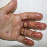 It is important to recognize that acral cyanosis with persistent livedo reticularis and digital gangrene can be a presenting manifestation of APS. These cutaneous manifestations should prompt histologic evaluation for thrombotic vasculopathy in addition to serologic tests for APS autoantibodies. Although APS may be treated with anticoagulants and antiplatelet agents, CAPS may require more aggressive therapy with systemic steroids, plasma exchange, IV immunoglobulin, rituximab, and/or eculizumab.