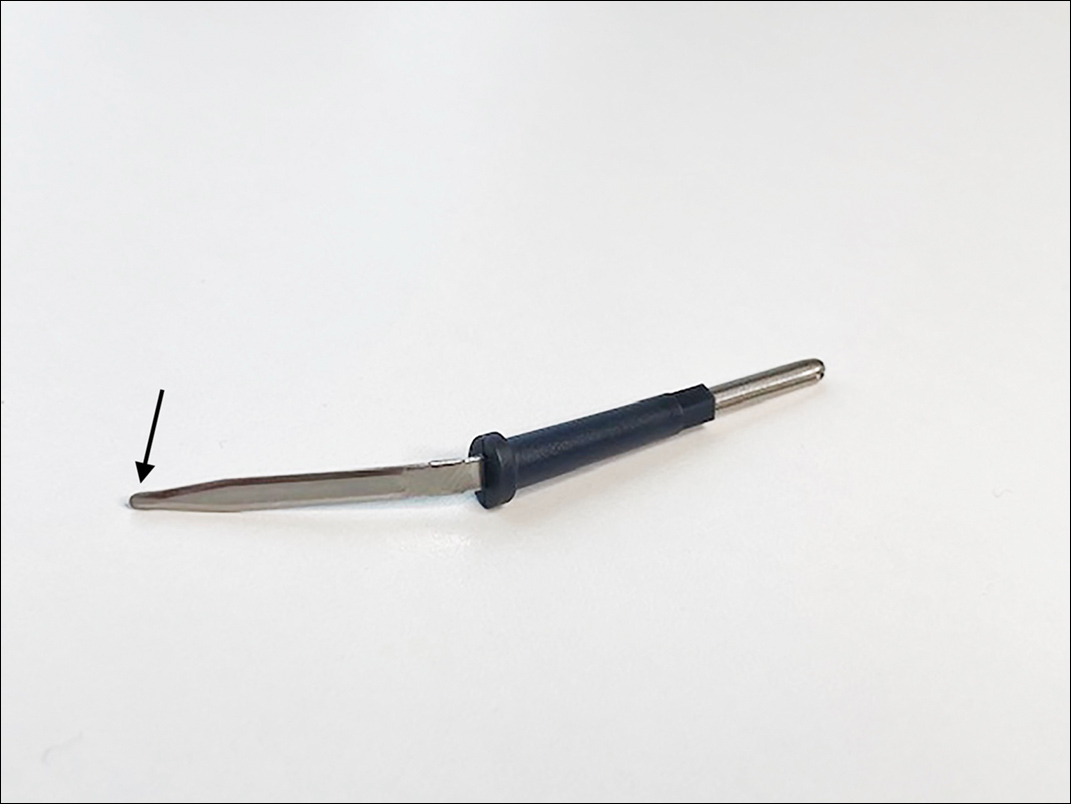 A convenient and painless way to obtain a mineral oil scabies preparation from under the fingernail is to use the tip of a disposable hyfrecator, readily available in most dermatology practices for use in electrosurgery (Figure 2). Using the blunt end of the hyfrecator tip for the mineral oil preparation would be done without attachment to the full apparatus.