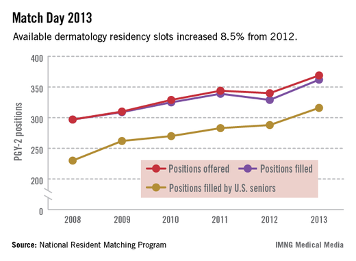 Compared with 2012, when the number of residency slots dropped slightly, the number of dermatology positions offered increased by 8.5% in 2013. The number of slots filled increased by slightly more than 10%, and the number of U.S. seniors taking dermatology residency positions increased slightly less than 10%, the NRMP data showed.
