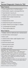 Cutaneous features frequently occur and are the most clinically apparent findings of TSC; if overlooked, diagnosis could be delayed, which ultimately increases mortality. The diagnosis of TSC continues to be based primarily on clinical grounds because most patients older than 5 years demonstrate multiple skin lesions.6 In 1992, specific diagnostic clinical criteria were created for TSC, which stratified the clinical features of TSC into 3 tiers—primary, secondary, and tertiary—based on their specificity.16 In subsequent years, some of the classic clinical signs once regarded as pathognomonic for TSC, such as single ungual fibroma or multiple renal angiomyolipomas, were questioned. New modifications to the original diagnostic criteria were necessary given the advances in both TSC clinical information and molecular genetics. In the summer of 1998, a consensus conference held in Annapolis, Maryland, was assembled by the Tuberous Sclerosis Alliance for the purpose of reevaluating and updating the clinical diagnostic criteria.7 The revised criteria were simplified into 2 main categories—major and minor features—based on the diagnostic importance and degree of specificity for TSC of each clinical and radiographic feature (Table 1). There are a number of considerations that merit close attention when applying these clinical criteria. Despite the large number of clinical features delineated, the diagnosis of TSC may be challenging early in life, particularly in patients younger than 2 years. The value of the clinical criteria for early diagnosis and prompt management of TSC is limited by the fact that many stigmata become apparent only in late childhood or adulthood. The lack of pathognomonic signs of TSC can add to the challenge of diagnosing subtle or atypical cases.6