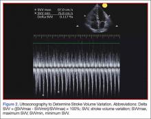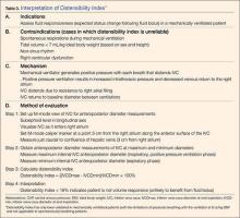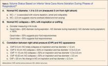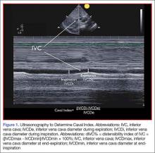 A systematic review by Zhang et al,26 showed change in IVC measured with point-of-care ultrasonography can reliably predict fluid responsiveness, particularly in patients that are mechanically ventilated. A caval index of 0.72 corresponds to CVP less than 7 cm water; a caval index of 1.23 corresponds to CVP 8 to 12 cm water; and a caval index of 1.59 corresponds to CVP greater than 13 cm water. The distensibility index is similar and calculated based on the IVC diameter at end-expiration (IVCDmax) and end-inspiration (IVCDmin).27 The ratio of (IVCDmax - IVCDmin)/IVCDmin is expressed as a percentage (dIVC%) in mechanically ventilated patients. A distensibility index less than 18% may indicate that the patient is not volume responsive (Tables 2 and 3; Figure 1).