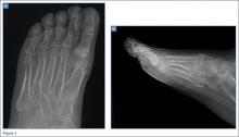 A 55-year-old man presented with a 2-day history of acute first toe pain in his right foot after banging the affected toe on a door. Physical examination demonstrated a swollen first toe with marked tenderness to palpation. Radiographs were obtained (Figures 1a and 1b).