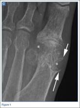 The radiographs of the right foot excluded fracture as the underlying etiology of the patient’s pain. The findings included soft tissue swelling and periarticular (ie, near but not involving the joint) erosions involving the first metatarsal head (white asterisks, Figure 1c). The erosion on the medial aspect of the metatarsal head had remodeling of bone at the periphery of the erosion, which created the appearance of “overhanging edges” (white arrows, Figure 1c). The radiographic appearance suggests the diagnosis of gouty arthritis.