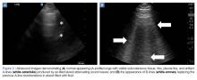 When lung sliding is present, the appearance in M-mode is that of the “seashore” or “sandy beach.” The hyperechoic white pleura is seen as moving with the respiratory cycle. Additionally, lung artifacts such as A-lines, horizontal reverberation artifacts; and B-lines (also referred to as “comet-tails”), vertical lines arising from distended subpleural alveoli, will be seen in a normal lung. If pneumothorax is present, no sliding or comet-tail artifacts will be present at the pleural surface. Although A-lines may also be absent in pneumothorax, studies have shown that the absence of lung sliding and the presence of A-lines are associated with increased specificity (94% vs 78% with absent lung sliding alone) for diagnosing occult pneumothorax. 9