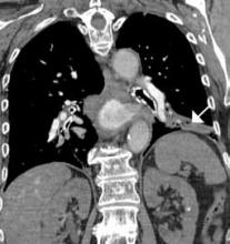 CTA has long been the standard technique for evaluating PE. In addition to reported sensitivities of 96% to 100% and specificities of 97% to 98% with multislice detectors,2 CTA also provides information on disease severity, such as clot burden, evidence of right heart strain, and the presence of pulmonary infarct (Figure 1). It also can reveal alternative etiology and diagnosis in negative cases (Figure 2).