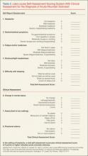 The onset of symptoms (eg, headache, anorexia, nausea, vomiting, weakness) may occur at 2,000 m in the setting of rapid ascent—most commonly at 6 to 12 hours, but onset can range from 1 hour to 2 days after ascent. If symptoms begin after 3 days, other diagnoses should be considered. Symptoms of AMS are generally worse after the first night of sleep at elevation. On physical examination, vital signs are usually normal, though postural hypotension and tachycardia are possible. Oxygen saturation may be markedly decreased after rapid ascent, and chest auscultation may reveal rales in 20% of patients.4 Peripheral and facial edema may also be present. Funduscopic examination may show venous tortuosity and dilation, and retinal hemorrhage is common in ascents over 4,800 m.