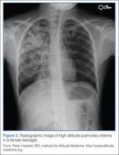 The most common cause of death from altitude illness is HAPE,12 a form of noncardiogenic pulmonary edema. This condition generally occurs at elevations above 3,000 m. Symptoms begin 2 to 5 days after ascent and progress in a typical pattern. A patient will initially experience a nonproductive cough and dyspnea at rest. The dyspnea worsens, and the cough becomes productive of pink, frothy sputum. Without medical intervention, lethargy, coma, and death may follow.