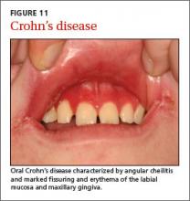 Inflammatory bowel disease. Crohn’s disease may affect the gastrointestinal tract anywhere from the mouth to the anus and may initially present with oral findings that may not correlate with abdominal symptoms. Oral Crohn’s disease may present as mucosal cobblestoning, mucosal tags, deep linear ulcerations, gingival hyperplasia, lip fissuring, aphthous ulcers, and angular cheilitis (FIGURES 10 AND 11). Other features may include diffuse, painless swelling of the lips and mucosal erythema.