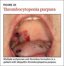 Atrophic glossitis may indicate a vitamin B deficiency. Thrombocytopenia and leukemia may present with oral petechiae, purpura, oral hematomas, or hemorrhagic bullae (FIGURE 20).13 Painless pseudomembranous mucosal erosions may be a presentation for secondary syphilis.16