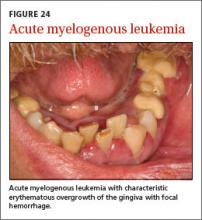 Hematologic malignancies may initially present (or demonstrate evidence of relapse) in the oral cavity. Leukemia typically presents with sheet-like overgrowth and swelling of the gingiva with associated erythema and bleeding (FIGURE 24), whereas lymphoma typically presents as a solitary mass or ulceration. Solid tumors that metastasize to the oral cavity may present with localized unexplained soft or hard tissue growths, with or without associated neurologic symptoms (eg, paresthesia).